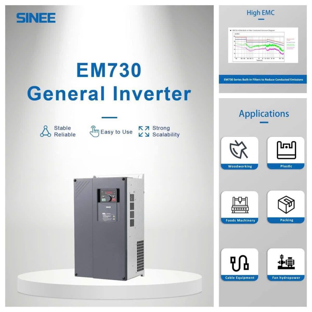 - Dải tần số rộng, điều khiển tốc độ cao: Nhiều dòng Sinee có thể điều khiển tới 500 Hz hoặc hơn, tùy loại. Dẫn đến khả năng mở rộng ứng dụng trong các máy cần tốc độ cao hoặc chịu tải thay đổi